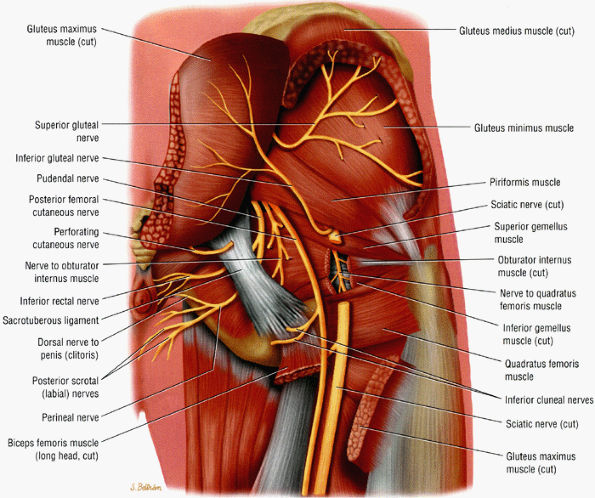 The nerve follows the course of the piriformis muscle and can be traced as it curves around the ischial spine into a more posterior and lateral location in the upper thigh. There the nerve is seen within an abundant stripe of fat between the greater trochanter and the ischial tuberosity (Fig. 6.8).