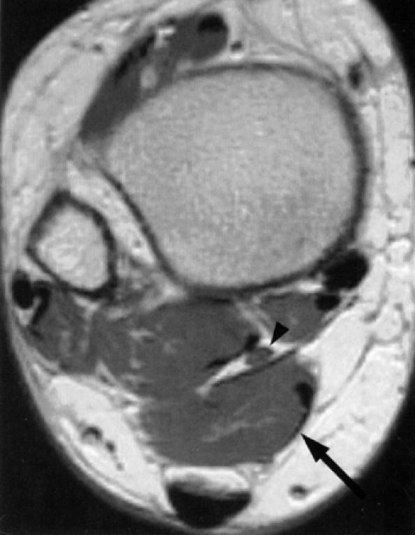 FIGURE 6.50 ● Accessory soleus muscle. Axial T1-weighted image illustrates an accessory soleus muscle (arrow) anteriorly displacing the tibial nerve (arrowhead) in the distal leg.