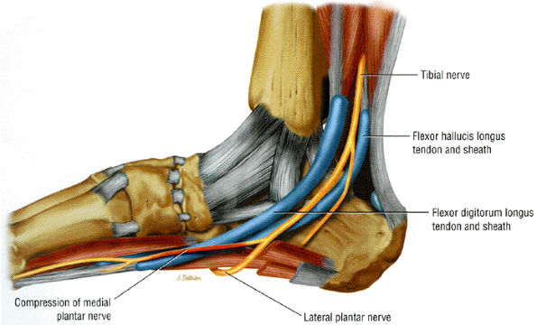 Tenosynovitis with tendon sheath distention at the intersection of the flexor digitorum longus and flexor hallucis longus tendons in the talonavicular region may occur in entrapment of the medial plantar nerve.