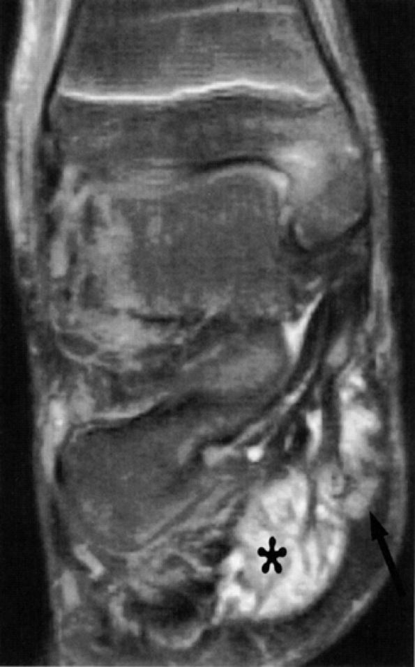 FIGURE 6.52 ● Medial plantar neuropathy. Denervation edema of the flexor digitorum brevis (asterisk) and abductor hallucis muscles (arrow) is shown on this coronal T2-weighted fat-suppressed image of the ankle.