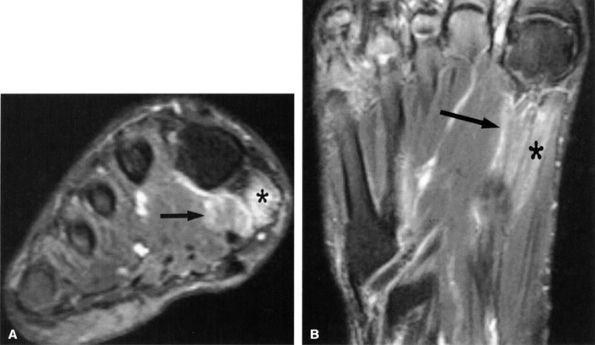 FIGURE 6.53 ● Medial plantar neuropathy. Oblique coronal (A) and axial (B) fluid-sensitive fat-suppressed images of the foot show denervation edema in the flexor digitorum brevis (arrow) and abductor hallucis (asterisk) muscles.