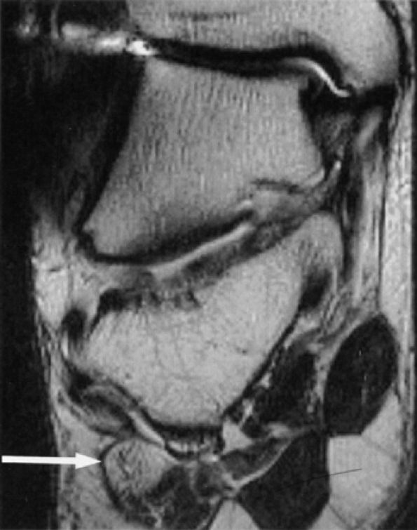 At the ankle and dorsal foot, injury to the deep peroneal nerve can be surmised when obliteration of the fat along the course of the nerve and its branches is identified. Mass effect by ganglia or tumors may also be depicted (Fig. 6.34).