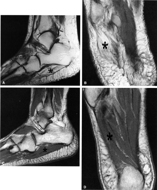 FIGURE 6.56 ● Neuropathy of the inferior calcaneal nerve (Baxter's neuropathy) in a 66-year-old patient with tarsal tunnel varicosities. Sagittal (A) and axial (B) T1-weighted images of the ankle demonstrate denervation atrophy of the abductor digiti quinti muscle (asterisk). (C and D). Normal abductor digiti quinti muscle (asterisk) in an asymptomatic patient for comparison.