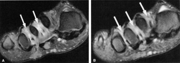 T2-weighted images serve to confirm the diagnosis as well as to exclude other diagnostic possibilities, such as true neuromas, intermetatarsal bursitis, ganglion cysts, and synovial cysts.178,193,194,195