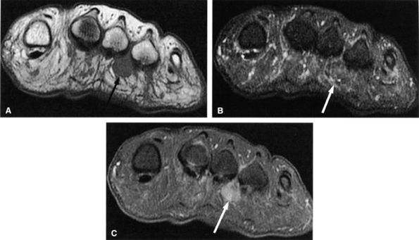 FIGURE 6.59 ● Third intermetatarsal Morton's neuroma. Dumbbell mass (arrows) of intermediate to low signal on both T1-weighted (A) and T2-weighted (B) images extends from the intermetatarsal space to the plantar aspect of the foot. (C) The mass enhances after gadolinium administration.