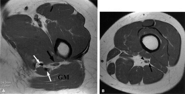 FIGURE 6.8 ● Normal sciatic nerve. (A) An axial PD-weighted image at the upper thigh demonstrates a normal ovoid-shaped sciatic nerve (black arrow) anterior to the gluteus maximus muscle (GM), highlighted by the fat. Note the proximity of the nerve to the hamstring tendons (white arrows). (B) An axial PD-weighted image at the middle thigh depicts the tibial (arrowhead) and smaller peroneal (arrow) divisions of the sciatic nerve in a common sheath before they diverge in the proximal knee.