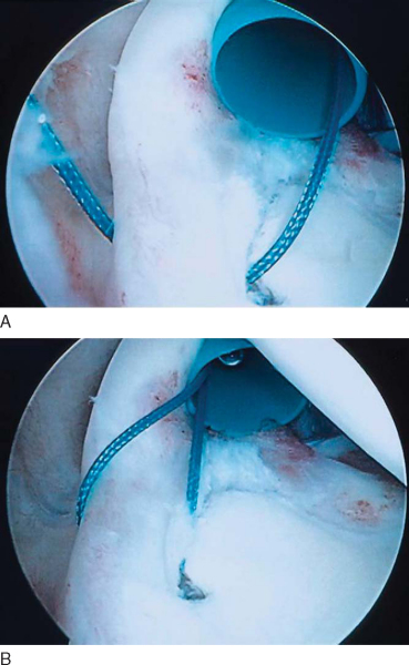 ). Posterior anchors are tied through the anterior portal either medial or lateral to the biceps tendon. Additional suture anchors are placed posterior or anterior to the biceps anchor until it is secure. Posterior anchors are most easily placed through the portal of Wilmington as described before. Anterior anchors may be placed through the anterior cannula. Although we prefer the lasso suture passer for passing sutures, BirdBeak suture retrievers (Arthrex) may alternatively be used, depending on the surgeon’s preference. The 45-degree BirdBeak is ideal for passing sutures in the posterior labrum through the anterior superior cannula; the 22-degree BirdBeak works well for the anterior labrum.