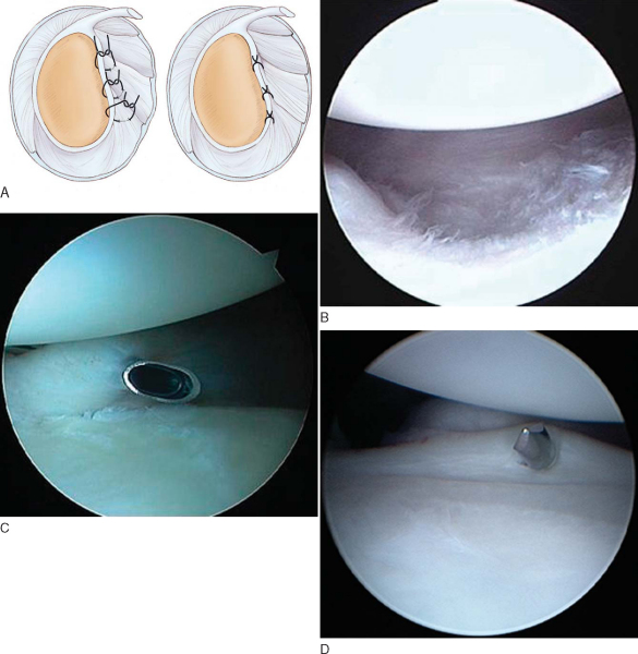 We generally perform a mini-plication in the anterior capsule when there is a persistent drive-through sign, evidence of anterior capsular tissue attenuation, or more than 130 degrees of external rotation in the 90-degree abducted position. The anterior capsular tissue to be plicated is first abraded with a rasp or “whisker” shaver. Capsular redundancy is then obliterated by suturing a lateral portion of the capsule to the glenoid labrum. The amount of tissue plicated depends on the amount of redundancy observed on arthroscopic examination (