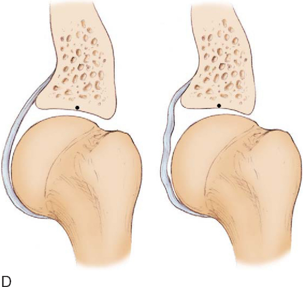 | • | Posterolateral (portal of Wilmington): anchor placement and suture passage in posterior labrum ( Fig. 10-5 ) |