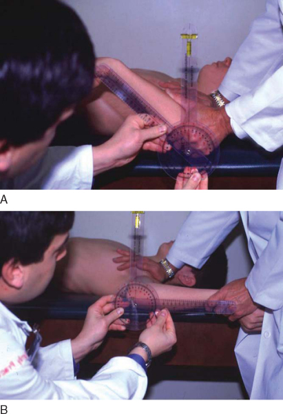 | • | The arm is abducted 90 degrees to the body, scapular plane; internal rotation and external rotation are measured from a vertical reference point (perpendicular to floor) ( Fig. 10-3 ). |