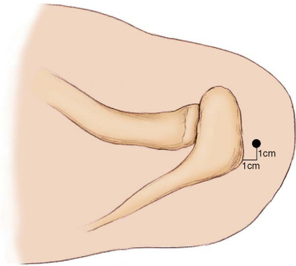 The portal of Wilmington is used for posterior anchor placement. Only small-diameter instruments are passed through this portal. No cannulas are placed in this portal to prevent damage to the rotator cuff tendons. A spinal needle again is used to localize the portal, which is approximately 1 cm anterior and 1 cm lateral to the posterolateral acromial margin (see
