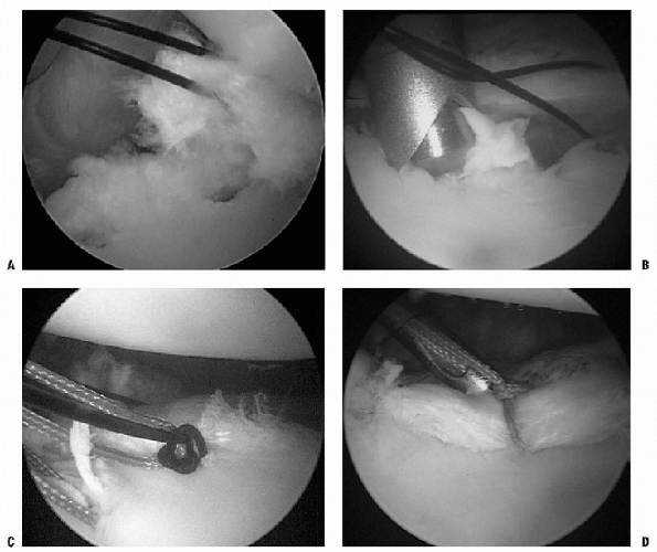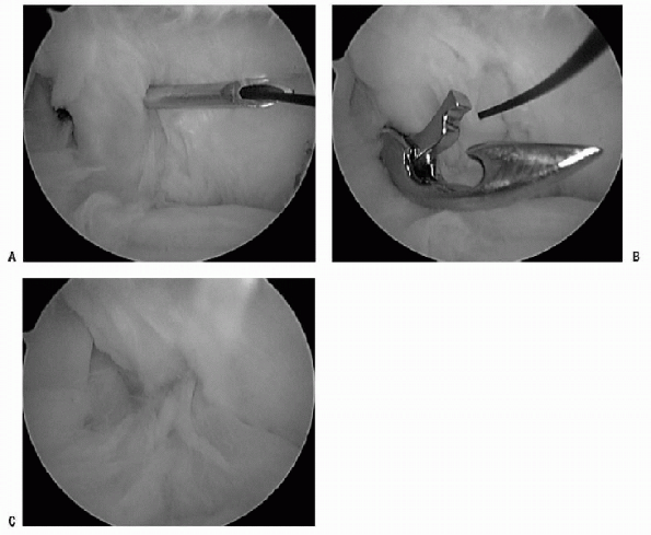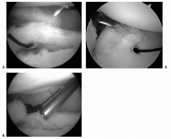 Figure 17-17 A: Suture shuttling device through the middle glenohumeral placing a monofilament suture into joint. B: Tissue penetrator through superior glenohumeral ligament and coracohumeral ligament retrieving monofilament suture. C: The rotator interval is closed extra-articularly.