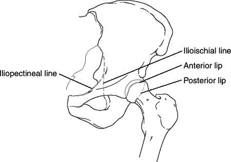 anterior lip of the acetabulum, and the posterior lip of the acetabulum.(From Bucholz RW, Heckman JD, eds. Rockwood and Green’s Fractures in Adults, 5th ed. Baltimore: Lippincott Williams & Wilkins, 2002.) -