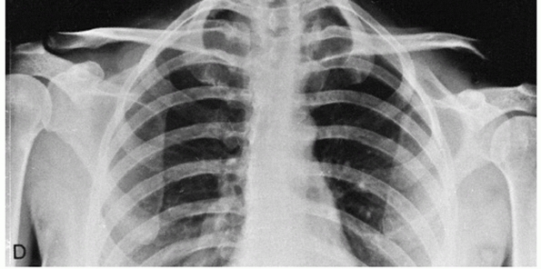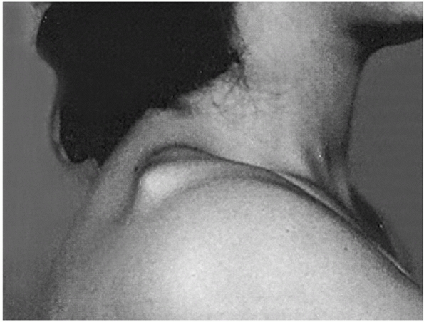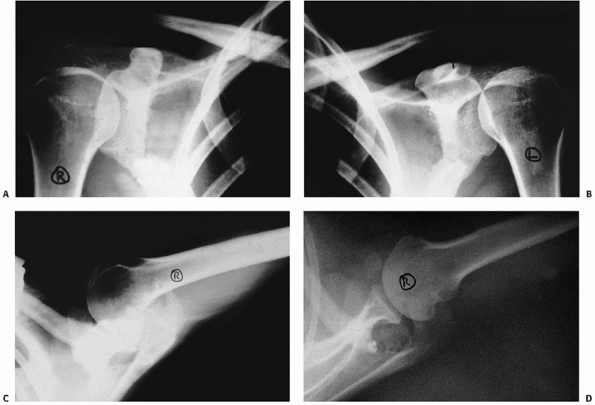Anteroposterior radiograph demonstrating a chronic AC joint dislocation on the left upper extremity. Note that the clavicles are in the same position bilaterally, and the left scapula is displaced inferiorly. (From Rockwood CA, Young DC. Disorders of the acromioclavicular joint. In: Rockwood CA, Matsen F III, eds. The Shoulder. Philadelphia: WB Saunders, 1990:434.) |
