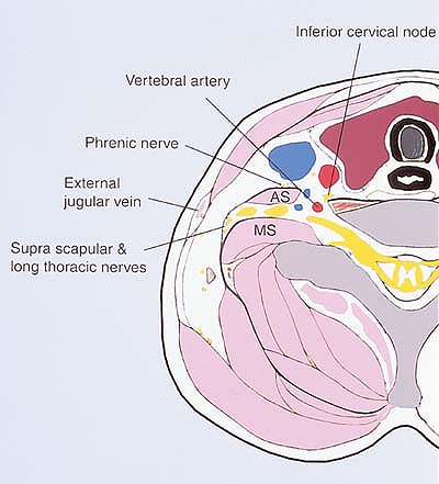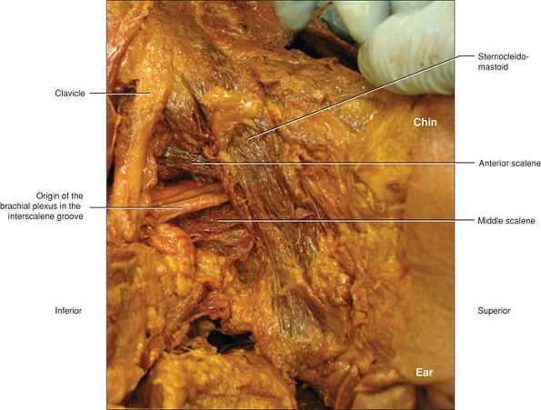A very limited dissection demonstrating how the brachial plexus lies in the neck as transverse from its origin of individual roots from the cervical spine to somewhat join into divisions and group into cords. The divisions travel in a similar plane at this level and are organized in a parallel fashion to each other. The plexus is framed by the sternocleidomastoid at the superior edge of the triangle until it gives way to the anterior border of the anterior scalene. At times the anterior scalene is not prominent as in this specimen. The inferior border is the clavicle. The triangle is completed by the posterior border in the middle scalene muscle. |