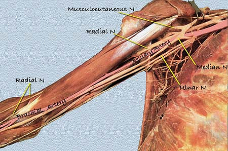 vessels but without the radial, axillary, and musculocutaneous nerves.
