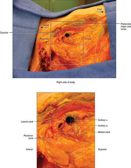 Sagittal section of the infraclavicular area. This dissection is a sagittal section of the right side demonstrating the relationship of the brachial plexus below the clavicle. The pectoralis major and minor are virtually the only muscles above the plexus. The lung is not visible and has not been violated. At the level of a vertical infraclavicular block, the lung would be visible. The axillary vein is prominently seen inferior to the plexus, which surrounds the axillary artery. The fascicles of the lateral cord (which contains one-half of the median nerve) is virtually laying on the artery. The posterior cord (which contains 100% of the radial nerve) is actually superior but is deeper than the artery from the surface of the skin. It is large and round in this specimen compared with the lateral cord, which is flattened and surrounds the upper surface of the artery. The medial cord (which contains the other part of the median nerve and the ulnar nerve) is just under the artery and is the deepest cord to the skin. |