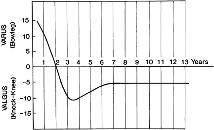 Normal development of knee alignment from infancy through childhood. (Adapted from Salenius P, Vankka E. The Development of the Tibio-femoral Angle in Children. J Bone Joint Surg Am 1975;57:259.) |