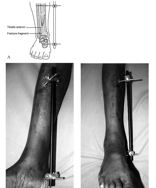 Figure 25.25. A: Anteroposterior radiographs of a C-type tibial pylon fracture. B: