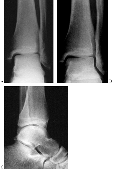 on anteroposterior projections. Comparison radiographs of the normal ankle are very helpful. (Modified from Chapman MW. Fractures and Fracture-Dislocations of the Ankle (Chapter 34). In Mann RA, Coughlin MJ, eds. Surgery of the Foot and Ankle,6th edition. Philadelphia: Mosby, 1992:1448.) |