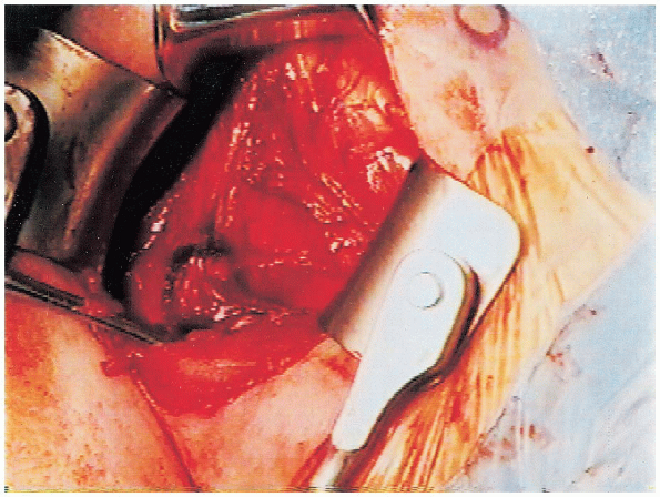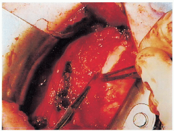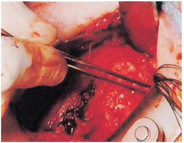 Mersilene in simple interrupted sutures (Fig. 4-19). It is very important that a secure subscapularis repair be performed to avoid the risk of disruption postoperatively.