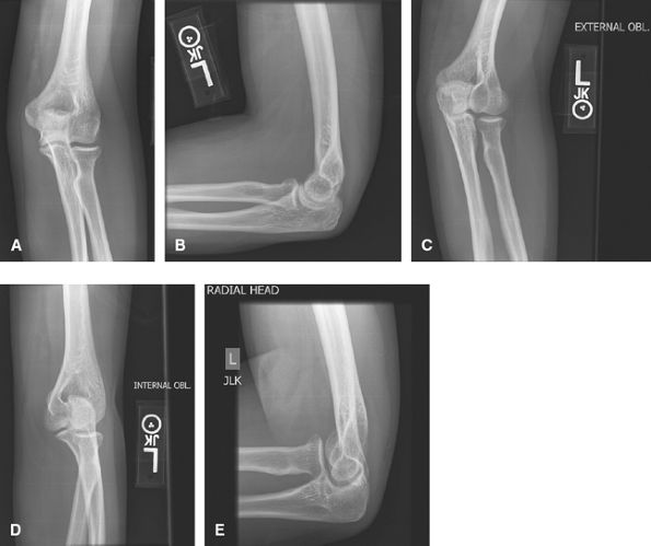 Figure 10 (A) AP. (B) Lateral. (C) Lateral (external or radial) oblique. (D) Medial (internal or ulnar) oblique. (E) Radial head view.