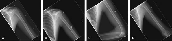 Figure 12 (A) AP to include shoulder joint. (B) Lateral to include shoulder joint. (C) AP to include elbow joint. (D) Lateral to include elbow joint.