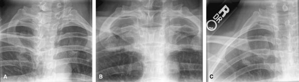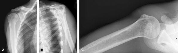 Figure 14 (A) AP scapula,- neutral rotation. (B) Lateral “Y” view. (C) Axillary view, as tolerated by patient.