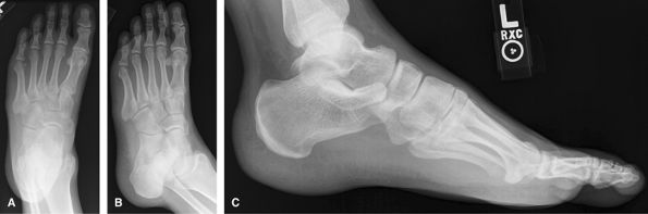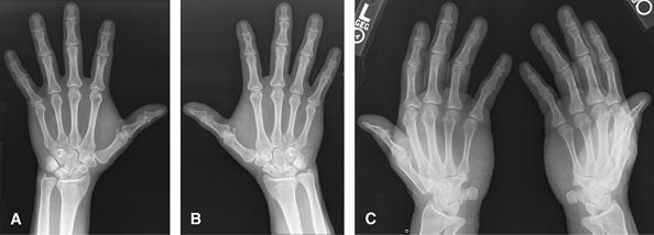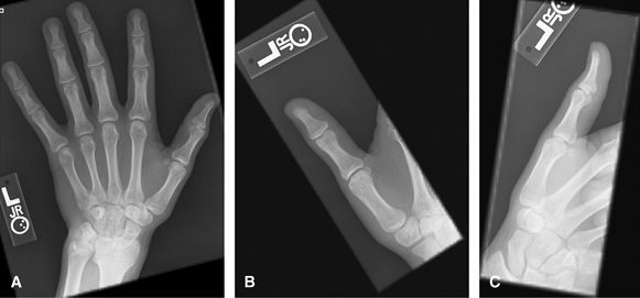 Figure 3 (A) PA of hand. (B) Oblique of hand. (C) Lateral of hand.
