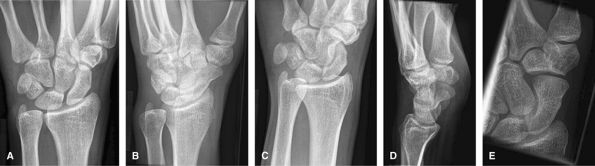 Figure 6 (A) PA wrist. (B) Ulnar oblique wrist. (C) Radial oblique wrist. (D) Lateral wrist. (E) Navicular view.