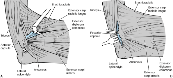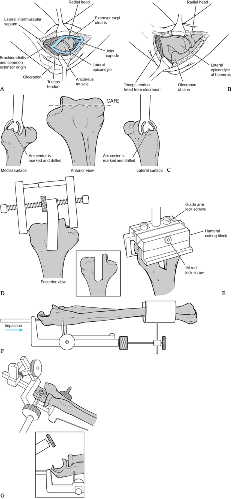 Figure 102.1. Interposition arthroplasty technique: A: The Kocher interval is identified between the anconeus and the extensor carpi ulnaris. B:
