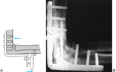 Figure 102.23. Elbow arthrodesis–plate fixation: A: Dynamic compression plate and tensioning device. B: