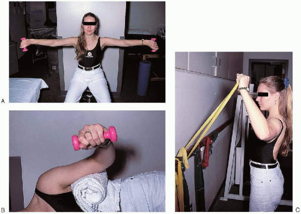 FIGURE 2-26. Rotator cuff strengthening exercises. A: Supraspinatus strengthening exercises. B: External rotator strengthening exercises. C: Tubing exercises.