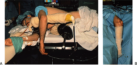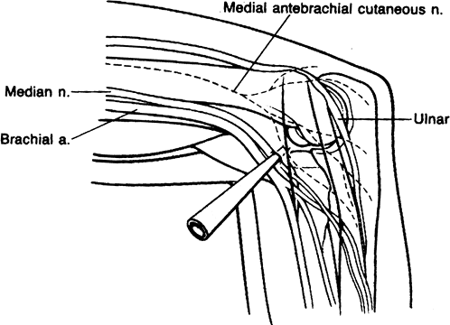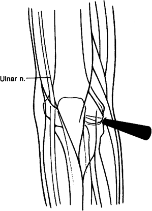 capitellar articulation and the soft tissues are immobilized to allow the cannula to enter the anterior aspect of the elbow (Fig. 2-6).