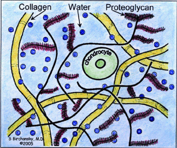 both compressive and tensile loads. The solid collagen fibers are of importance in maintaining tensile stiffness and strength.1 However, given their ratio of length to thickness in structure, collagen is unable to withstand high compressive loads, which is a property maintained by the integrity of the proteoglycan component.