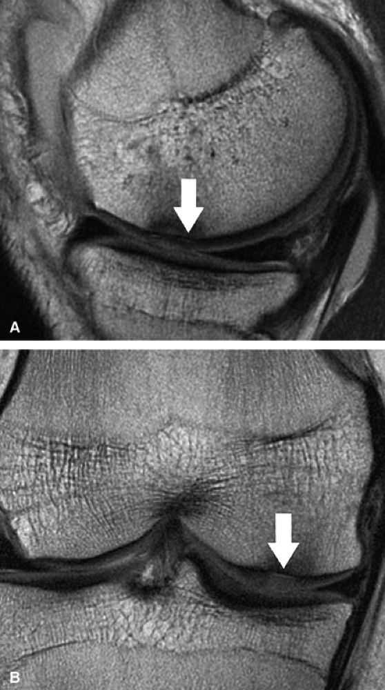 FIGURE 7.10 ● Sagittal (A) and coronal (B) fast spin-echo MR images of the knee in a 24-year-old professional football player. There is hyperintensity in the radial zone, indicating deep surface delamination (arrow), adjacent to the tidemark with no flap formation. There is also associated sclerosis of the subchondral plate. The patient underwent microfracture with a good clinical outcome.