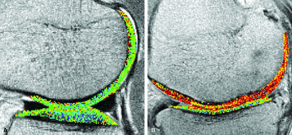 a 7-Tesla magnet, several changes, including a decrease in superficial zone thickness, an increase in total cartilage thickness over the submeniscal regions, and a shift in the maximum T2 of the articular surface were found. These findings indicate that the collagen of the superficial zone is disrupted in early stages of OA.90 Further, the increasing T2 of the superficial zone was detected in OA specimens obtained from portions of the tibia covered by meniscus, suggesting that these regions may show earlier signs of cartilage degeneration, before it is evident in other (more central) areas of the joint. These regional differences are most likely due to alteration in structural properties related to weight-bearing areas of the joint.84,90