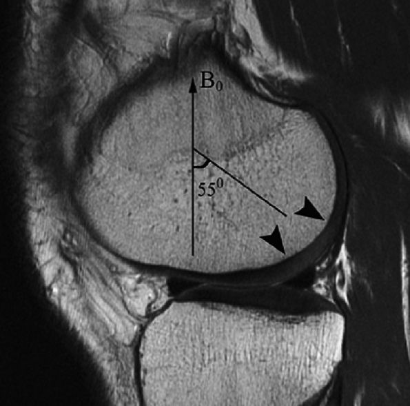 FIGURE 7.12 ● A sagittal fast spin-echo MR image of the knee in a 26-year-old man demonstrates the magic angle effect (arrowheads), causing prolongation of T2 with focal loss of gray-scale stratification at 55° relative to the external magnetic field (B0), indicating highly ordered structure components in the cartilage matrix. Note the normal gray-scale stratification of the remaining medial femoral condyle and tibial plateau.