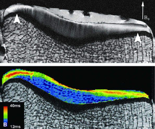 FIGURE 7.13 ● (A) Lateral tibial plateau of a 35-year-old woman. B0 = main magnetic field. In the central region of the plateau, prominent radial striations extend across a thick deep layer. Minor fibrillation is seen at the low-signal-intensity surface. In submeniscal and tibial eminence regions (arrowheads), the transitional layer is much thicker. (B) On a corresponding T2 map, changes in T2 parallel changes in signal intensity. Peak T2 values are located in the middle of transitional layer. (Reprinted by permission of