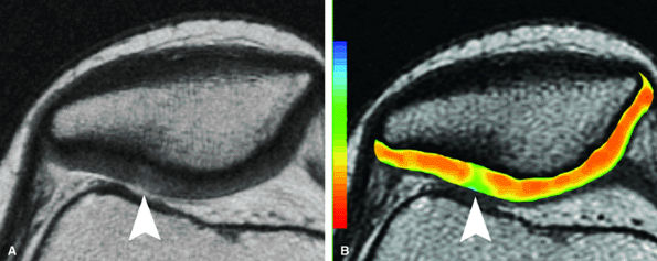 FIGURE 7.14 ● (A) Axial fast spin-echo MR image of the knee in a 25-year-old avid marathoner with anterior knee pain demonstrates focal increased signal (arrowhead) affecting normal-thickness cartilage of the lateral patella facet with subchondral sclerosis. (B) Corresponding quantitative T2 relaxation time map demonstrates geographic loss of stratification and prolongation in T2 values (arrowhead) throughout the thickness of the cartilage at this site.