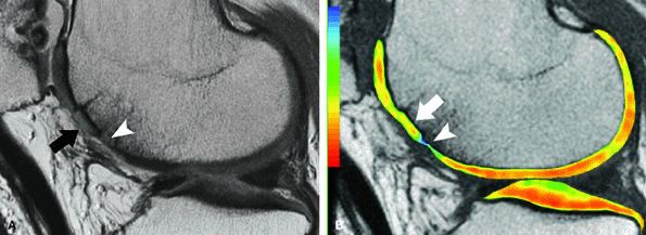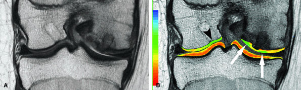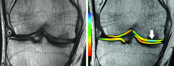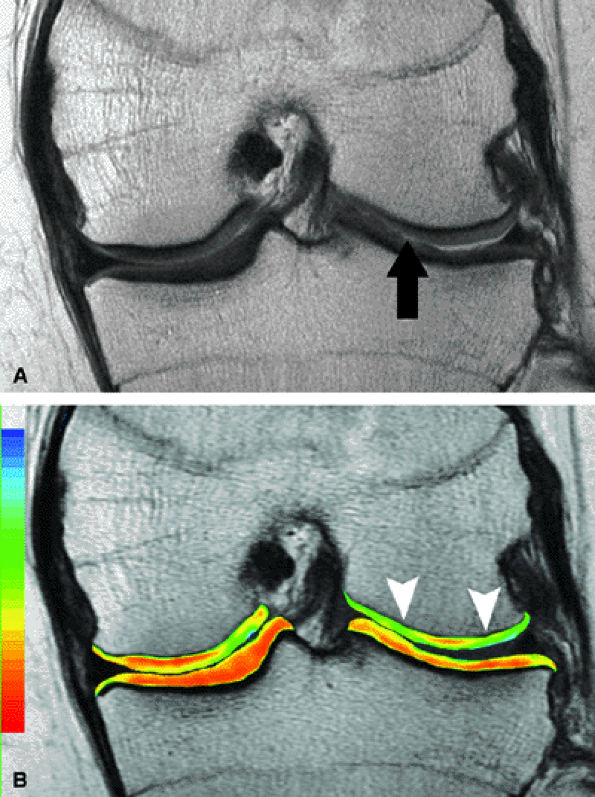 FIGURE 7.15 ● (A) Coronal fast spin-echo MR image of the knee in a 15-year-old girl with a previous partial meniscectomy demonstrates mild fibrillation of the cartilage overlying the lateral tibial plateau (arrow). (B) Corresponding quantitative T2 relaxation time map of the femorotibial articular cartilage coded to capture T2 values ranging from 0 to 100 msec demonstrates prolongation of T2 values over the plateau, but with unexpected prolongation over the lateral femoral condyle (arrowheads), which appeared normal on standard fast spin-echo cartilage-sensitive imaging. Green and blue reflect longer T2 values, yellow intermediate, and orange the shorter values.
