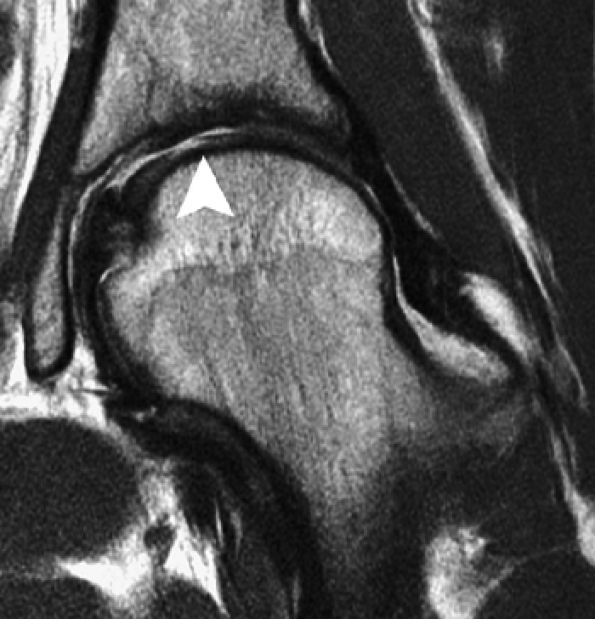 FIGURE 7.16 ● Coronal fast spin-echo MR image of the hip in a 28-year-old patient with active cartilage delamination and flap formation (arrowhead) over the weight-bearing aspect of the femoral head.