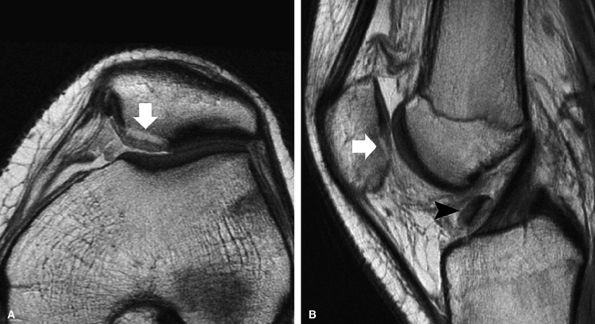 FIGURE 7.17 ● Axial (A) and sagittal (B) fast spin-echo MR images of the knee in a 15-year-old boy following a patellar dislocation demonstrate an osteochondral fracture of the medial facet (arrows). The displaced osteochondral fragment is seen against the synovial reflection of the ACL (arrowhead). Note the presence of high-signal-intensity bone marrow, low-signal-intensity subchondral plate, and intermediate-signal-intensity cartilage in the displaced fragment, distinguishing it from an isolated chondral shear.