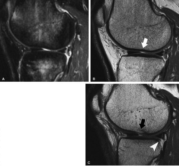FIGURE 7.18 ● Prospective MR evaluation of a bone bruise in the knee of a 28-year-old man with a complete ACL tear. Sagittal fat-suppressed (A) and fast spin-echo (B) MR images obtained at the time of injury demonstrate characteristic bone marrow edema with compression of cartilage over the lateral femoral condyle (white arrow). A sagittal MR image obtained 19 months later (C) demonstrates proud subchondral bone with focal cartilage loss over the condyle (black arrow), as well as flap formation over the tibial plateau (arrowhead). (Reprinted by permission of SAGE Publications, Inc., from Am J Sports Med, in press.)