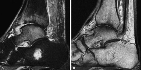 FIGURE 7.19 ● (A) Sagittal fat-suppressed MR image of the ankle in a 64-year-old man with OA of the tibiotalar joint demonstrates bone marrow edema pattern over both sides of the joint. (B) The corresponding cartilage-sensitive MR image demonstrates full-thickness cartilage loss, anterior osteophyte formation, and subchondral sclerosis. The presence of bone marrow edema over both sides of a joint in the setting of OA does not indicate superimposed fracture or osteonecrosis.