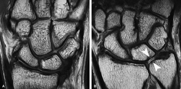 FIGURE 7.20 ● (A) Coronal fast spin-echo MR image of the wrist in a 28-year-old patient with normal articular cartilage. (B) A 61-year-old patient with ulnolunate impaction syndrome demonstrates full-thickness cartilage loss over the distal ulna and proximal pole of the lunate (arrowheads), with sclerotic change in the subchondral bone. Note also the full-thickness central defect in the articular disc.