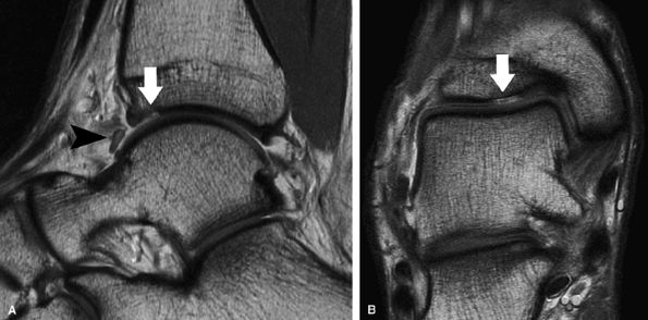 FIGURE 7.21 ● Sagittal (A) and coronal (B) fast spin-echo MR images of the ankle in a 16-year-old patient demonstrate an osteochondral shearing injury (arrows) over the anterior margin of the tibial plafond. A free cartilaginous fragment (arrowhead) in the anterior recess is present. Cartilage over the talar dome is preserved.