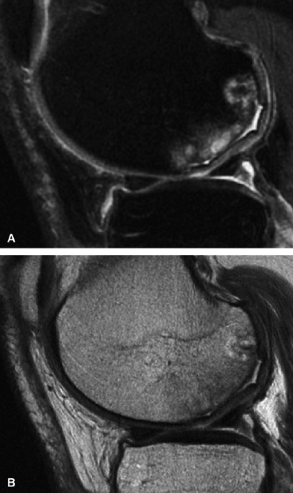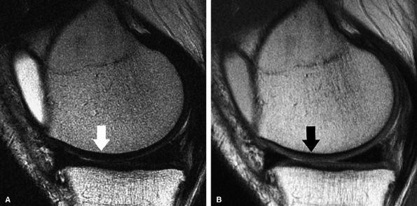 FIGURE 7.3 ● (A) Sagittal fast spin-echo MR image of the knee in a 39-year-old man performed on a high-field system (1.5 Tesla) demonstrates poor distinction between the subchondral plate and adjacent basilar components of cartilage at a TE of 110 msec (white arrow). (B) Corresponding image with all acquisition parameters held the same except for a moderate TE of 27.5 msec demonstrates improved cartilage–subchondral bone distinction (black arrow).