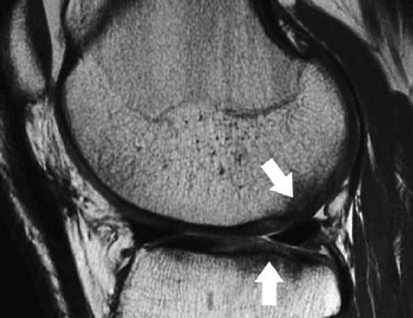 FIGURE 7.24 ● Sagittal fast spin-echo MR image of the knee in a 19-year-old patient, performed 15 months following microfracture of the posterior margin of the lateral femoral condyle and 12 months following microfracture of the lateral tibial plateau, demonstrates proud subchondral bone formation (arrows) and hyperintense reparative fibrocartilage over the sites of cartilage repair.