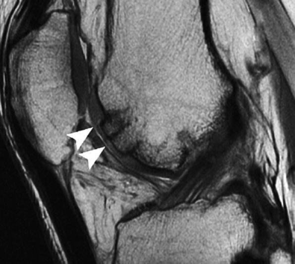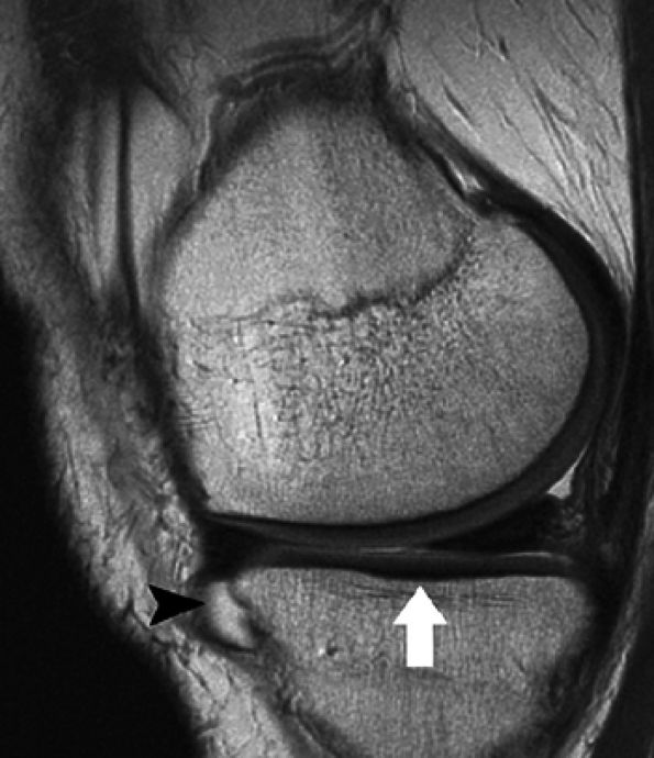FIGURE 7.5 ● Sagittal fast spin-echo MR image of the knee in a 50-year-old patient demonstrates differential contrast for the high-signal-intensity joint fluid within the meniscosynovial recess (arrowhead), the intermediate signal intensity of hyaline cartilage, and the low signal intensity of meniscal fibrocartilage. Over the tibial plateau cartilage, note the gray-scale stratification (arrow) with lower signal intensity in the basilar components.
